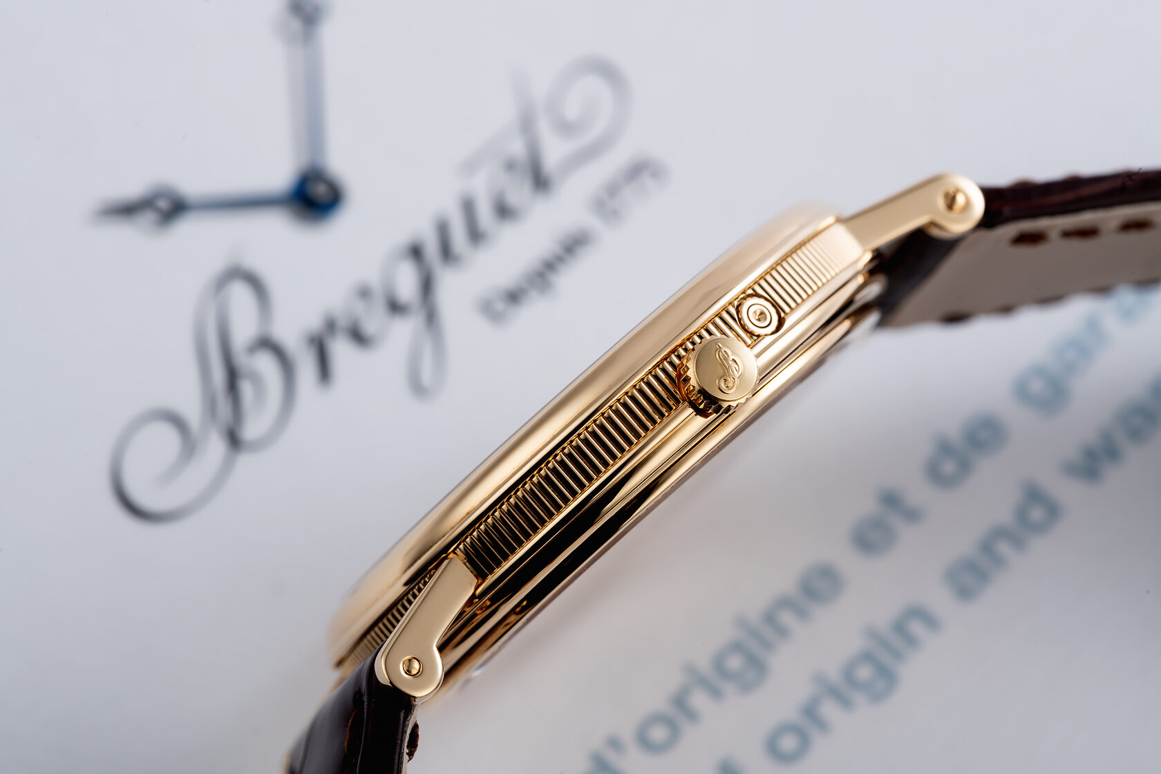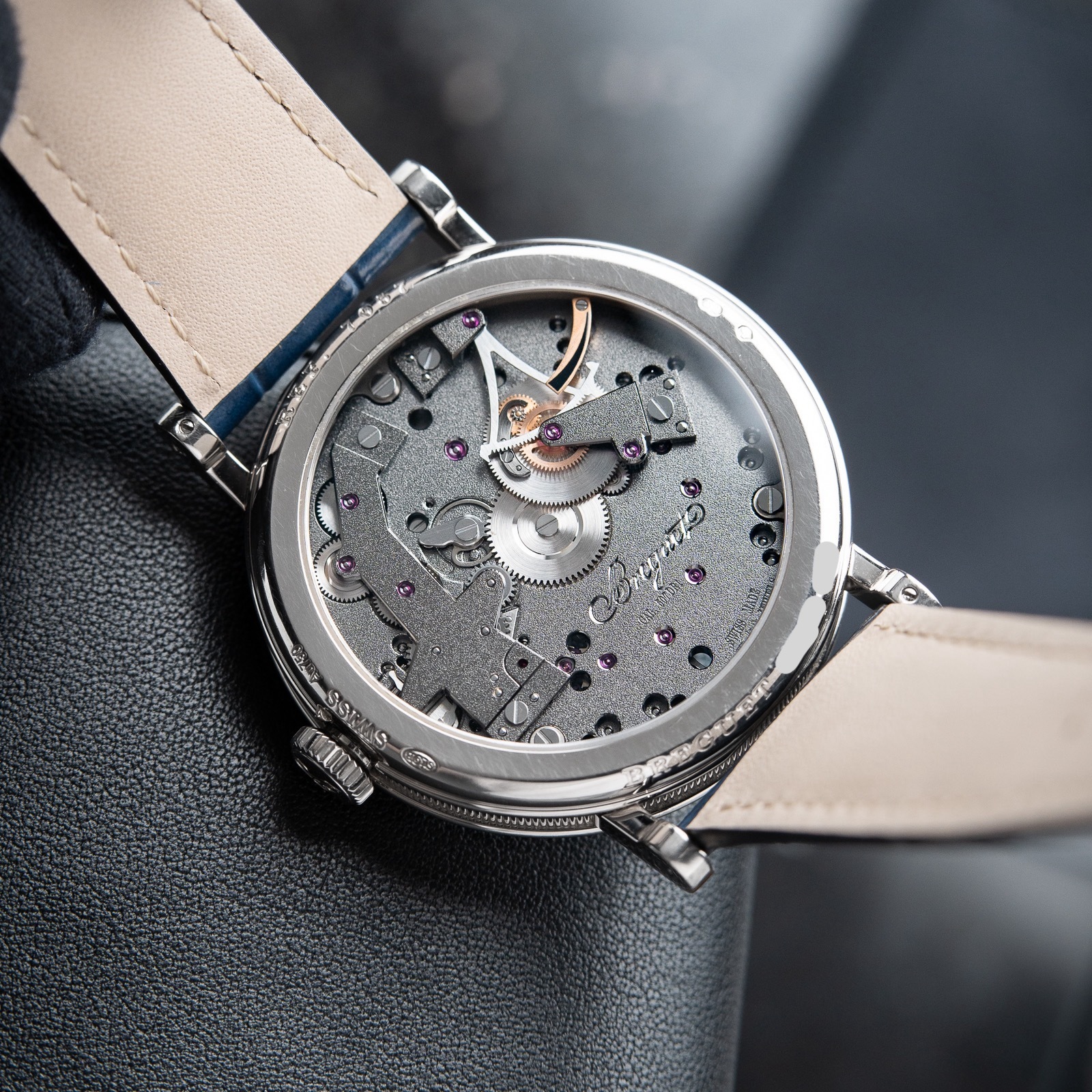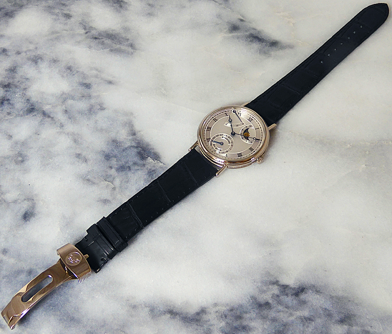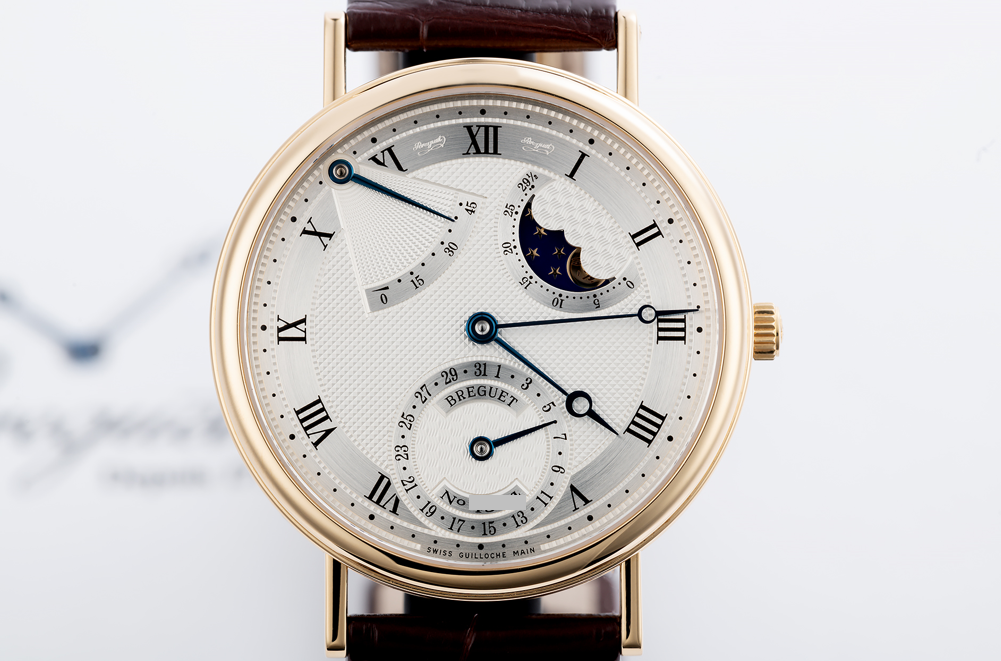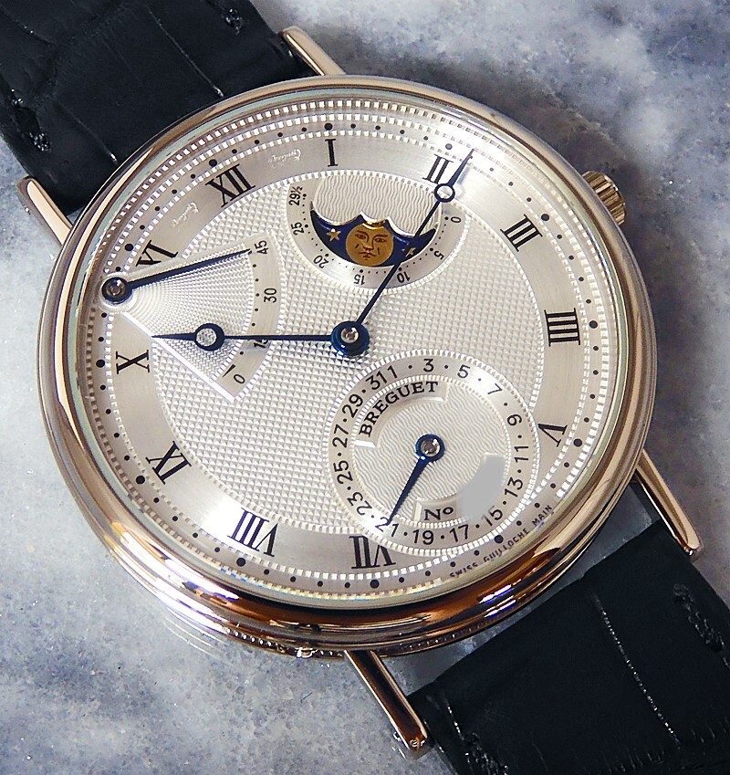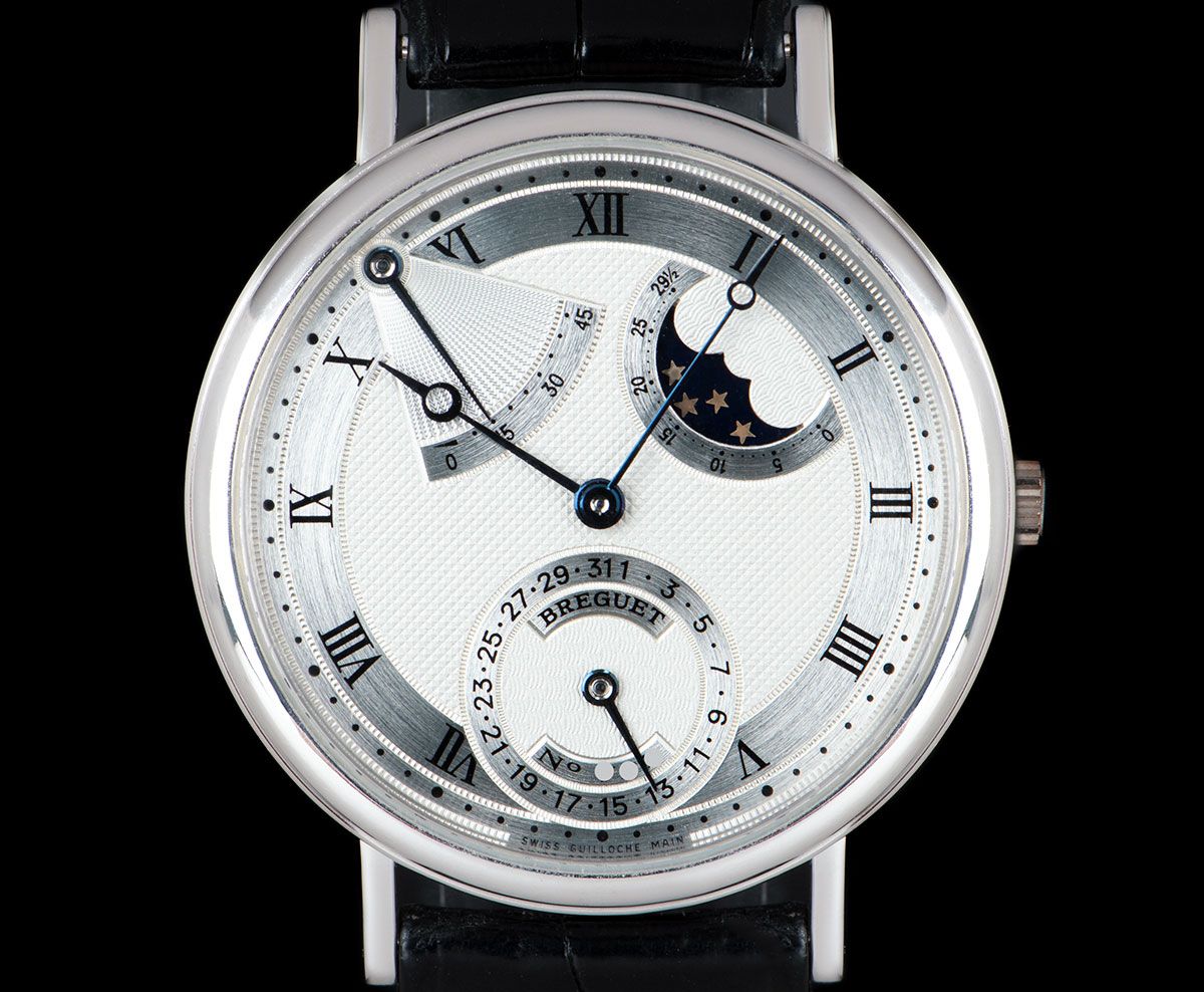 На гильошированном вручную посеребрённом циферблате отчетливо отображаются запас хода, дата и «хитрая» луна, а при ближайшем рассмотрении обнаруживается знаменитая секретная подпись Breguet.