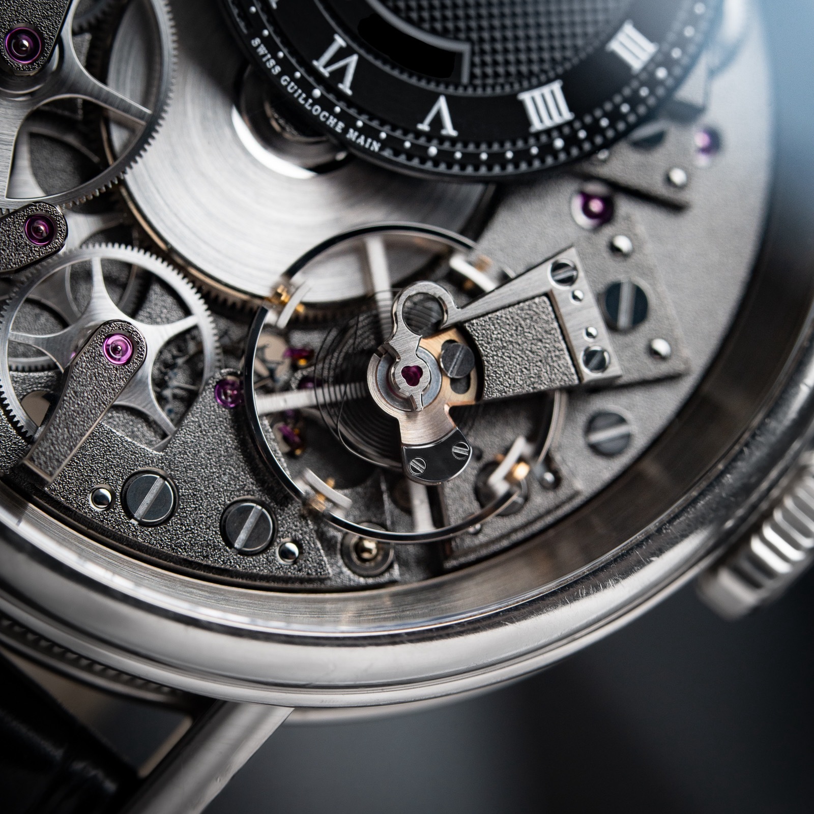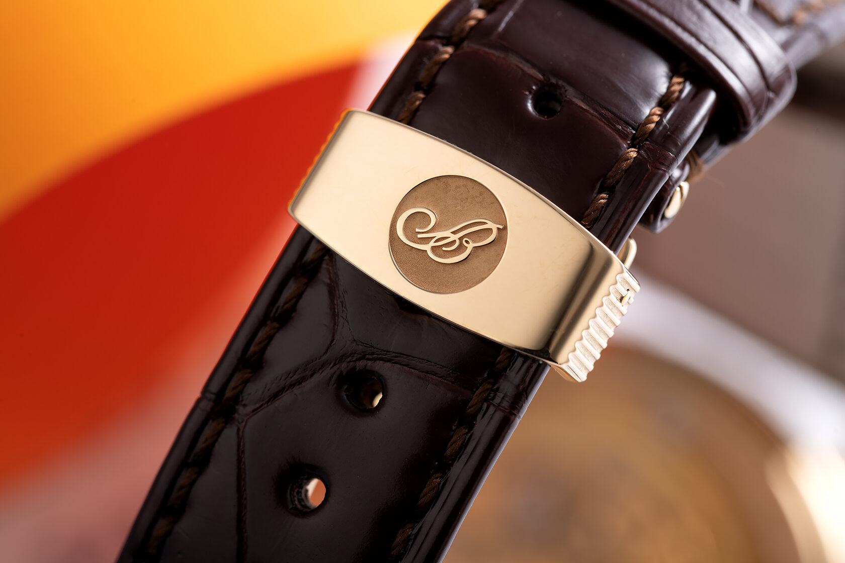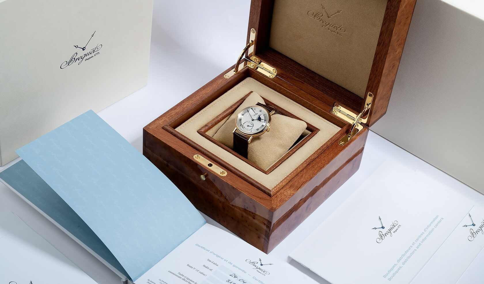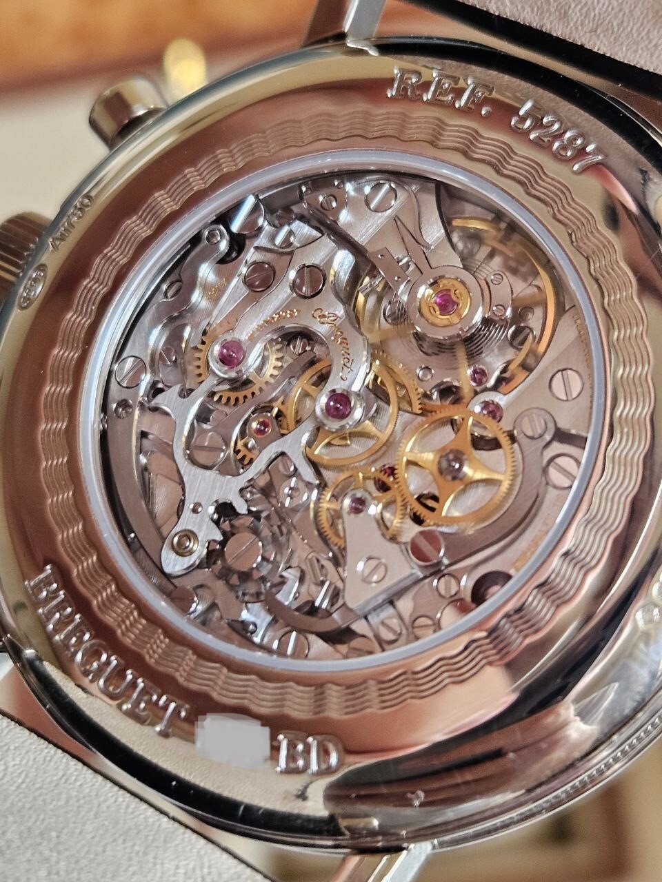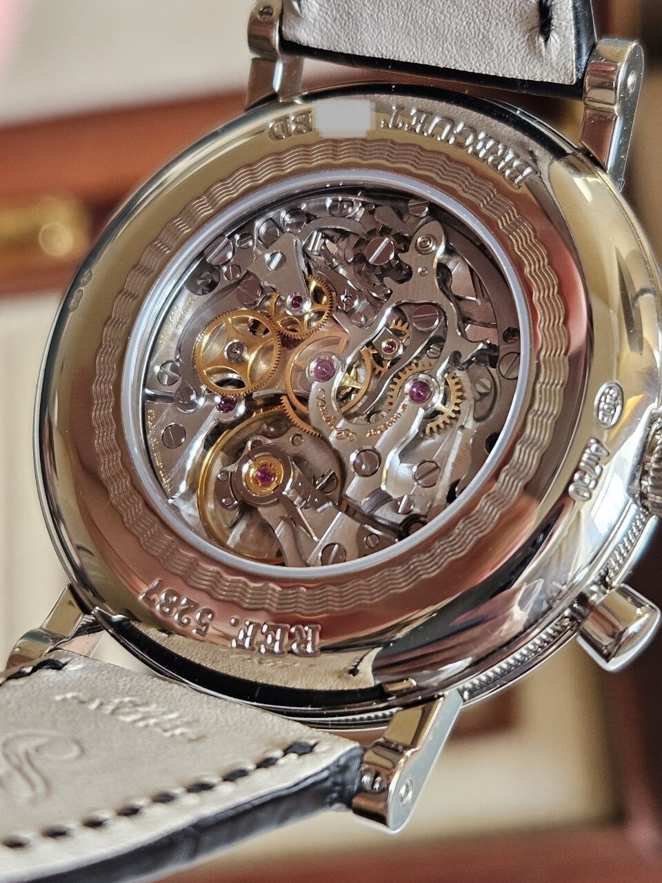 На гильошированном вручную посеребрённом циферблате отчетливо отображаются запас хода, дата и «хитрая» луна, а при ближайшем рассмотрении обнаруживается знаменитая секретная подпись Breguet.